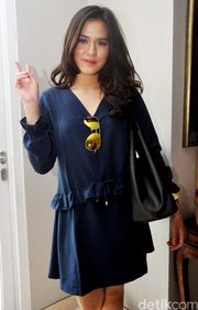 Raisa tampil simple dibalut dress biru dan sepatu Keds putih. Pool/Ismail/detikFoto.